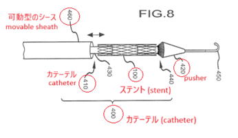294特許の図8は、カテーテル400の構成を説明する図であり、ステント100の全体がシース410から露出しているので本来であればステント100は自動的に拡張(展開)するが構成部材を説明するためにステント100が拡張(展開)する前の状態を図示している。ステント100は自動的に拡張(展開)する金属製の部材で、血管に挿入し移動させる際には可動型のシース410の中に収納されており、所定位置に達したときにカテーテルのシースからステント100の一部を押出し、部分展開させる。部分展開させたときに、ステント100の展開位置が正確ではないと判断されると、一部露出したステントをシースに戻し位置調整をする。