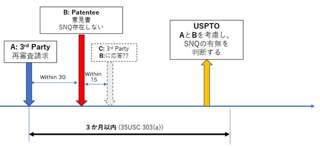 USPTOは、米国特許法303条(a)項に基づき、再審査請求後3か月以内にSNQの有無を判断する必要があるが、従来はこの判断に先立って特許権者の意見を取り入れる制度は存在しなかった。そのため、USPTOは基本的に請求人の主張のみに基づいてSNQ判断を行う構造となっていた。