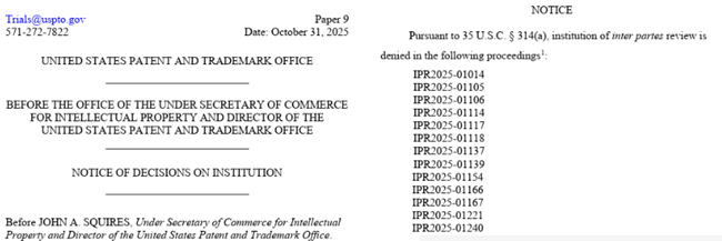 2025年10月31日には13件のIPR審理開始を否定