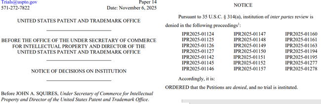 2025年11月6日には21件のIPR審理開始を否定