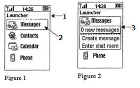 筆者が明細書を読む限りではクレーム1の後段のWherein句に「wherein the application summary is displayed while the one or more applications are in an un-launched state /Application 2を起動することなくApplicationサマリー3を表示する」とあり、この特徴に対応する明細書の開示は、該当するApplicationの上にハイライト表示され、1.2秒後にApplicationサマリー(図2の3)が表示されると記載されている。即ち、以下の図においてハイライト状態のMessage 2(どれがハイライト状態になるかはユーザーの使用頻度によっても変わる)をクリックすることなくApplicationサマリー3が自動的に表示されるという特徴が要のように理解される。